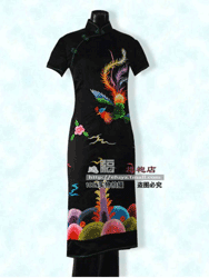 Bright fusia red peony emboidery silk cheongsam.Single gold piping.One gold flower button opened at the front collar ,the other at the front right side.Other parts line butons.Back zipper. Sleeveless.Ankle length.A bunch of coloful peonies emboideried on the front left side. Fashionable wedding dress.Suitable to wear in weding days.