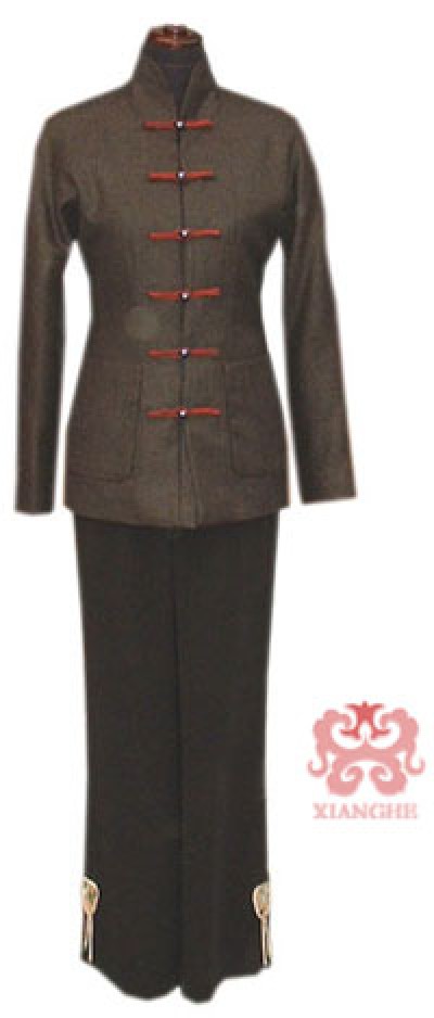 description: The top: long sleeves, mandarin collar, red single line buttons(you can change the style fo the buttons).The pants: Straight.