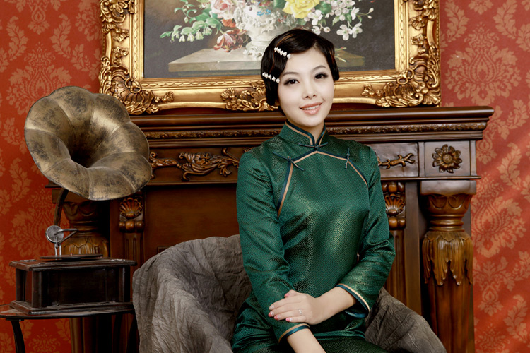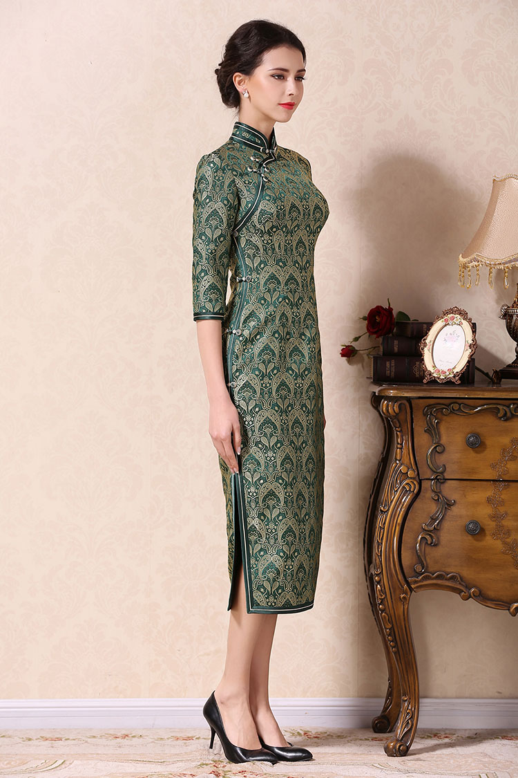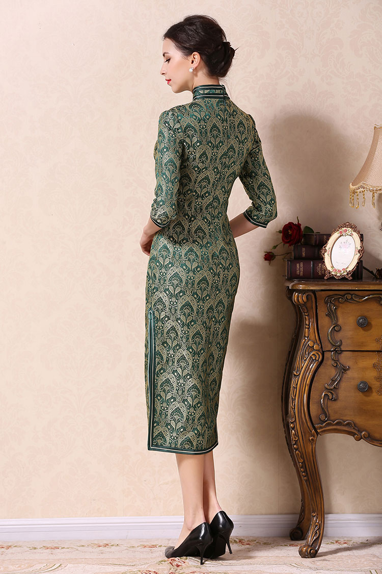 Long cheongsam under the knee length, Mandarin collar, zipper on the back ,double color piping,full lining, dark green brocade with obscures . Very elegant,very suitable for the lady who have more senses .