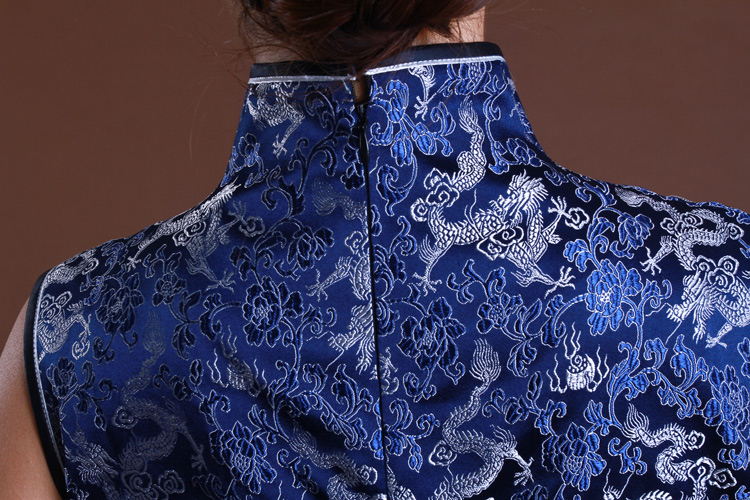 Description: traditional cheongsam, mandarin collar, frog buttons, side zipper, double slits, sleeveless, double piping, knee length. It is very noblest.