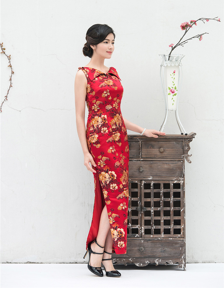 Description: Black rich flower on red background. Sleeveless. Mandarin collar, single-line buttons from armpit to the side end of dress. Double piping. 2 special buttons under the collar. Double slits. Ankle length.