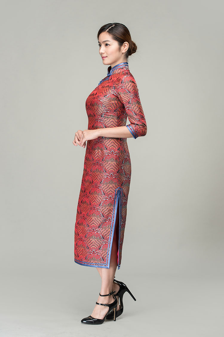 Dark red tapestry cheongsam dress with peacock tail pattern. Mandarin collar .Blue piping ,Raglan sleeves.