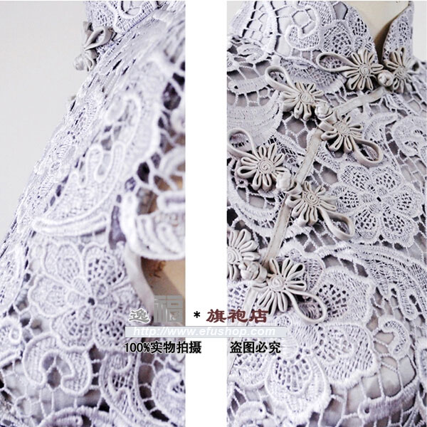 Description: Silver-grey lace cheongsam, mandarin collar, flower buttons, double slits, cap sleeves,above Knee length. It is very noblest.