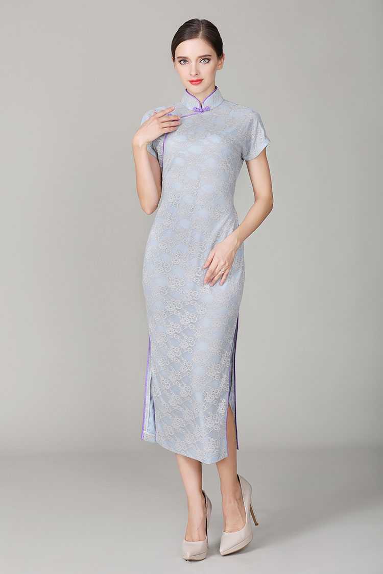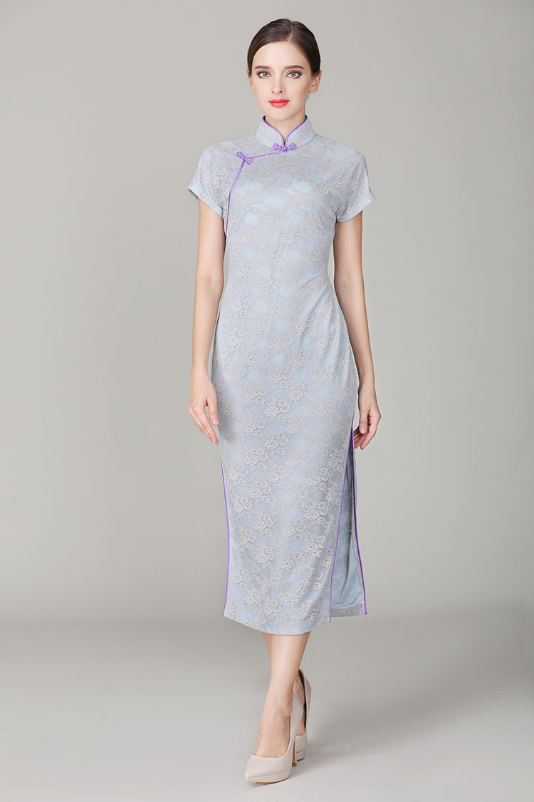 Description: Thin grey-blue lace ,qipao dress , with light purple buttons and edge , mandarin collar, double slits,raglan short sleeves,Under Knee length.