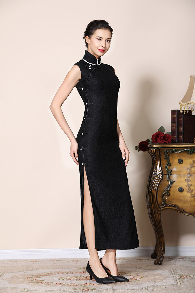 Description:Black lace fabric , mandarin collar,,full lining .There is a tring of beads under the collar like a necklace , open on the right side with one-line buttons ,all buttons‘heads are white Ceramic beads. Double slits, ankle length.Luxurious and elegant!